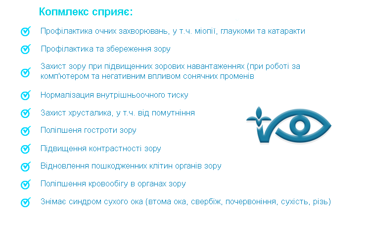 - Екстракт ягід чорниці Захищають сітківку від фотоушкодження, забезпечують гостроту зору, що попереджають вікове зниження зору, знижують ризик розвитку макулярної дегенерації, що допомагають у профілактиці катаракти.